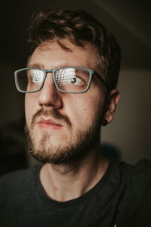A closeup of a young confident bearded man wearing eyeglasses looking at the camera