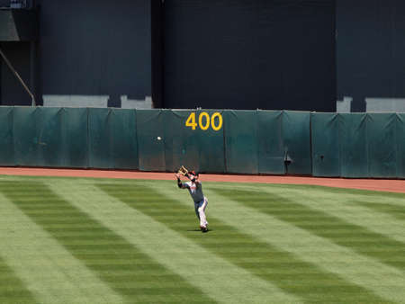 Giants 0 Vs. Athletics 3: Giants Center fielder Aaron Rowand opens glove to catch a pop-up to deep center. Taken May 23 2010 at the Coliseum Oakland California.