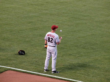 Diamondbacks vs. Giants: Diamondback 82 Motuzas tosses ball into the air as he stands around taken on September 28 2010 at Att Park in San Francisco California.
