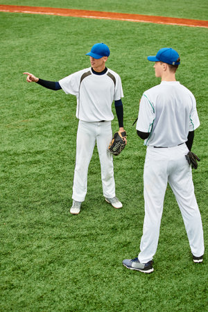 Two teenage boys discuss strategies while playing baseball on a bright green field.