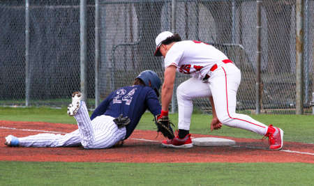 A baseball player is diving back to first base during a pick off play during a high school baseball game.