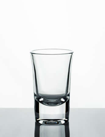 Empty glass shot on a reflective surface and white background.