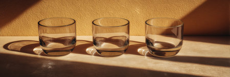 Three clear glasses are neatly positioned on a textured surface, basking in warm sunlight that casts dynamic shadows and highlights the glass details
