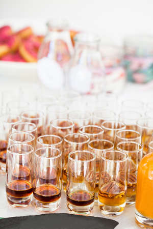 Shots on bar. colorful cocktails on bar counter