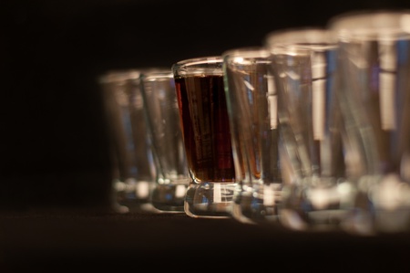 Vodka shots filled with alcohol on wooden black bar.