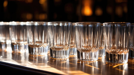 A row of glasses in a dark bar, reflecting elegance generated by artificial intelligence