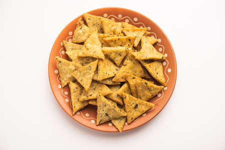 Indian Namkeen palak or Methi Mathri Triangle shape or Tikona - Salted Fenugreek or spinach leaves mixed Crackers