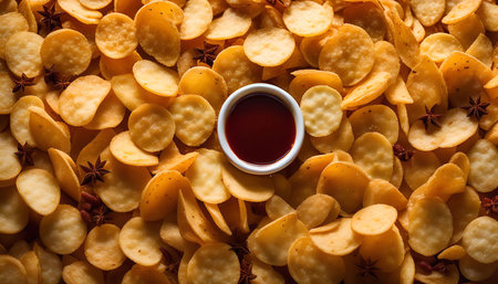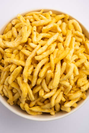 Close up Delicious Salty Spicy Namkeen Bhujia snack Texture. Spicy fried snacks. Abstract food background.