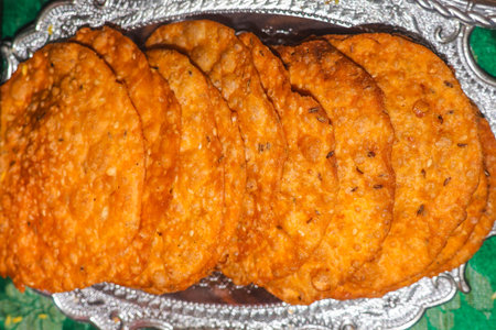Overhead view of Mathri, an Indian snack made of whole wheat flour or all purpose flour with fenugreek leaves and Carom seeds, with copy psace.