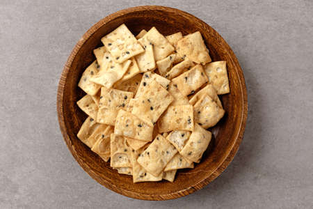 Round salted snack cracker on black stone surface