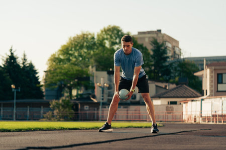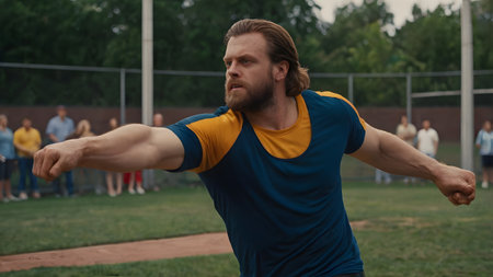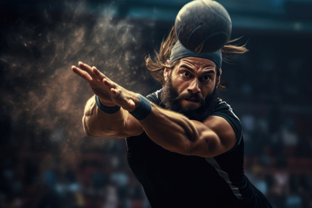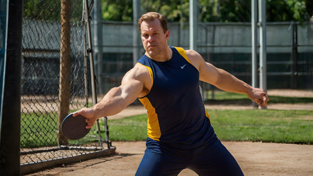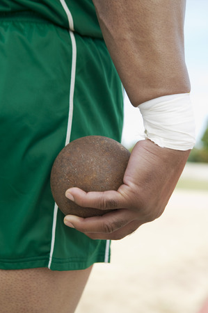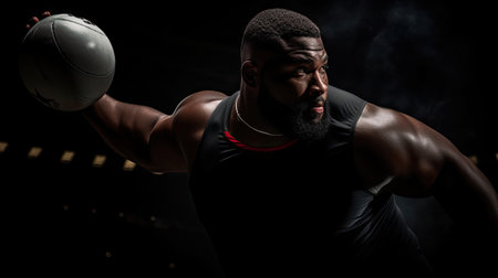 Athlete poised to throw shot put. Concept of athletic dedication and power