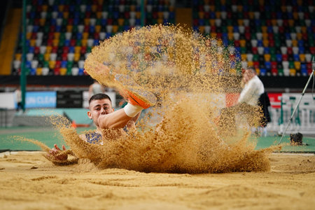 ISTANBUL, TURKIYE - JANUARY 19, 2025: Undefined athlete triple jumping during Turkish Athletic Federation Indoor Athletics Record Attempt Races in Atakoy Athletics Arena