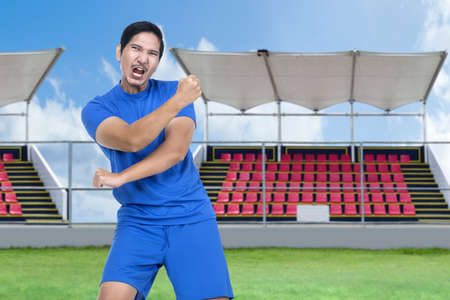 Asian man in white tank top is closing eyes and raising a fist while standing on racetrack. Finish a run or cheering, Outdoor exercise or training.