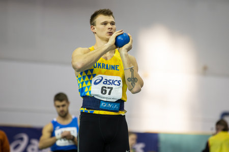 SUMY, UKRAINE - FEBRUARY 20, 2020: Oleksiy Kasyanov famous heptathlonist in shot put sector on Ukrainian indoor track and field championship 2020.