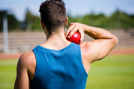 Rear view of male athlete preparing to throw shot put ball in stadium