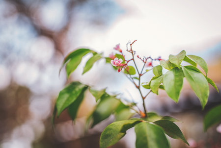 Closeup of an Averrhoa carambola plant. Star fruit flower and plant