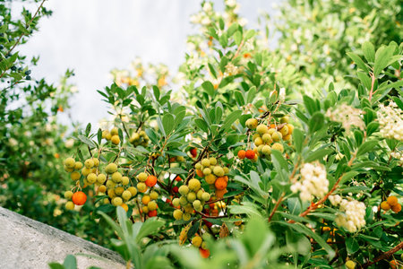 Blooming and fruiting strawberry tree grows in a green garden