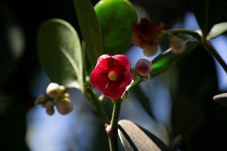 Fresh small red organic brazillian acerola cherry fruit (Malpighia Glabra) with green leaves. Fresh organic Acerola cherry on the tree, High vitamin C and antioxidant fruits.