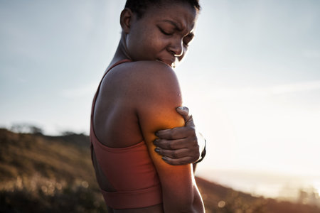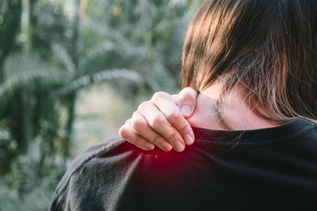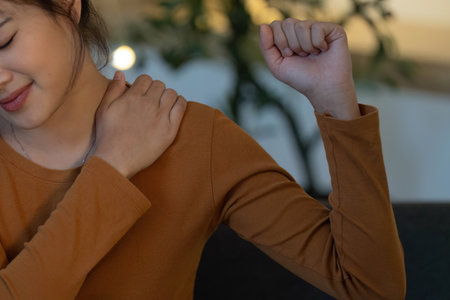 A woman touches her shoulder, experiencing pain and discomfort. This image captures the essence of physical discomfort and the need for relief and care.