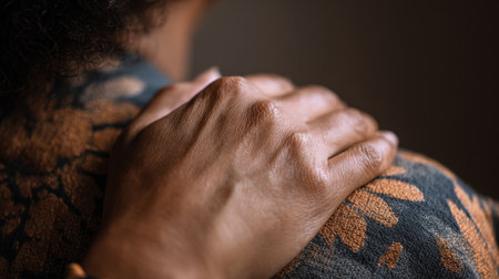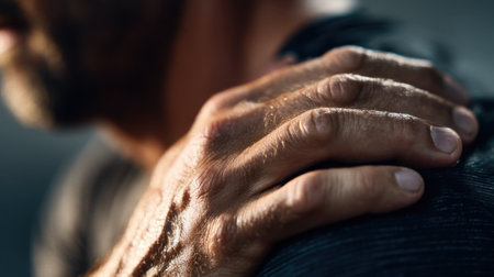 Close up of man hand resting on his shoulder, showcasing detailed skin texture and sense of contemplation. image conveys feeling of introspection and physicality