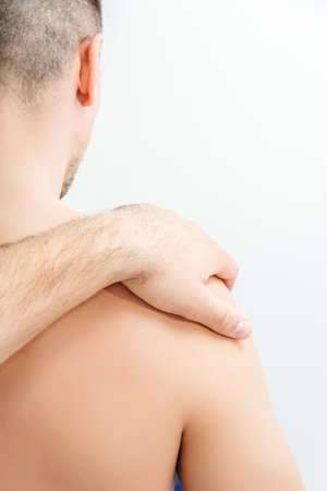 Closeup of man holding his injured painful shoulder.
