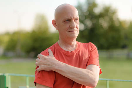 Serious old man touching his own shoulder. Bald man in red casual t-shirt. Trauma concept