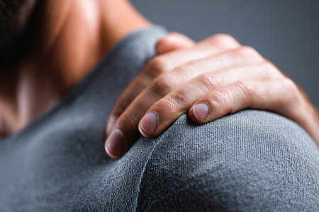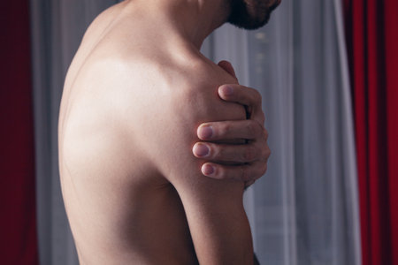 A serene close-up of a man gently touching his shoulder, capturing a moment of introspection and tenderness, illuminated by soft lighting to enhance the beauty of the skin texture.