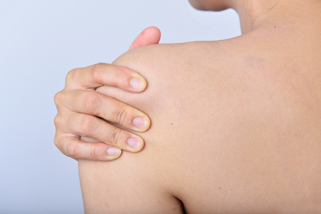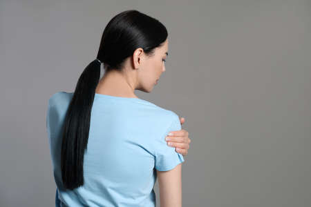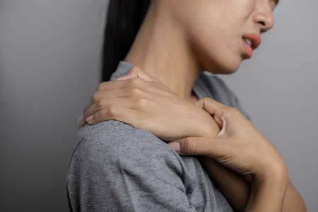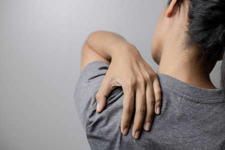 Woman hand scratching her shoulder with grey background, health care and medical concept