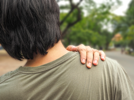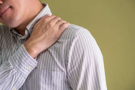Young man with shoulder pain and muscle injury use hand massage on body to relieve