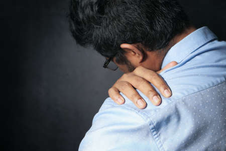 bearded man shoulder pain background.