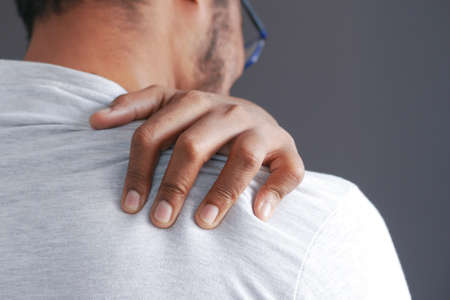 Man itching on shoulder. Medical and healthcare concept