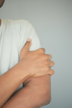 Man holding his shoulder in a neutral setting