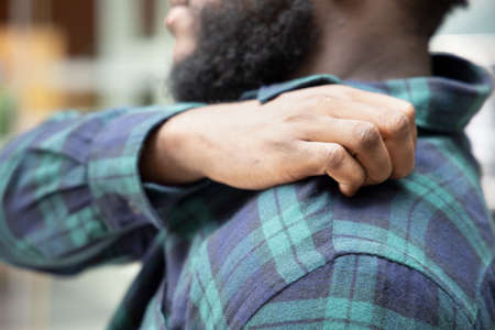 Man scratching suffering from itching hand skin; sick African man scratching his skin with allergy, rash, ringworm, tinea problem; skin care, dermatology concept; adult black African man model