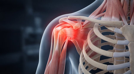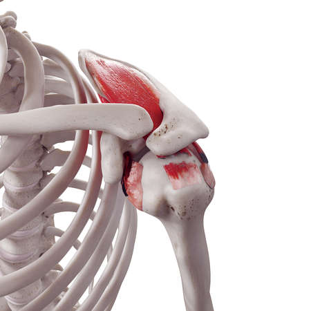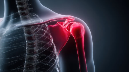 Medical illustration of shoulder injury with inflamed muscles. Anatomical visualization of orthopedic pain issues.