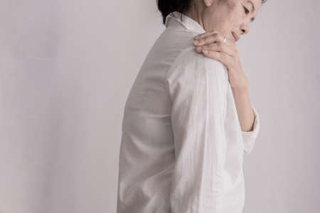 asian elderly woman having shoulder pain on isolated white background, concept of healthcare.