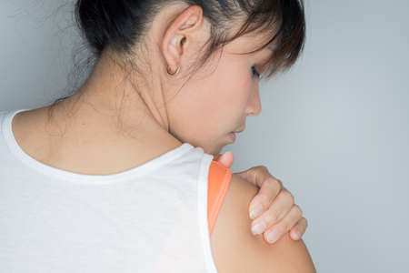 young woman with pain in shoulder, Ache in human body , office syndrome , health care concept