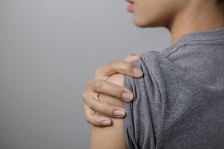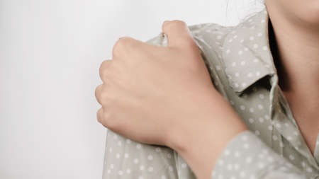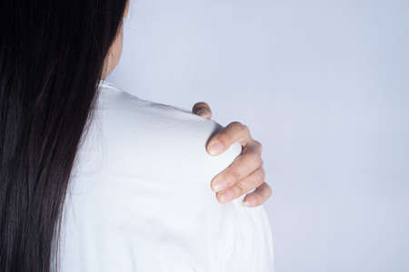 Shoulder pain. Female hand touching shoulder on white background. Close-up