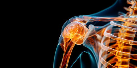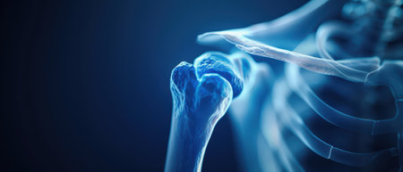 Detailed 3D illustration of a human shoulder joint, showcasing bones and ligaments with blue highlights on a dark background.