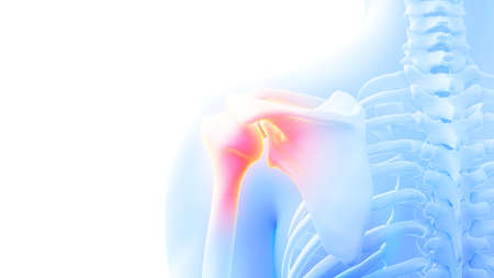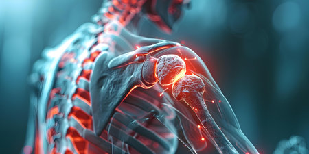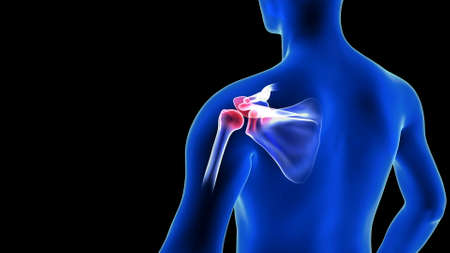 Transparent human upper body with focus on shoulder joint highlighted in red, displaying bones and spine in grayscale. The glowing red area symbolizes pain or discomfort in that region