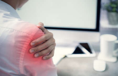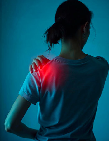 Individual touching painful shoulder with red glow indicating inflammation or tension