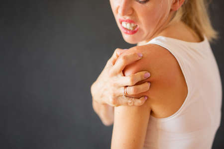 A woman in a casual sleeveless top gently supports her shoulder, highlighting a tender red patch that suggests soreness, set against a softly lit indoor backdrop.