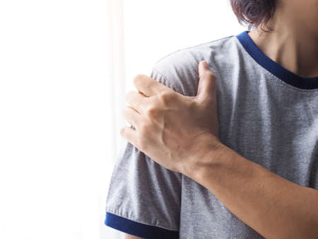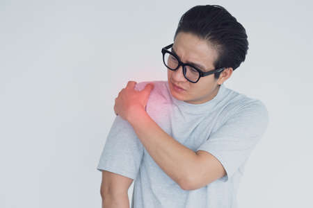 Pain in the shoulder joint of Southeast Asian elder man. Concept of frozen shoulder.