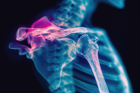 This photo depicts an x-ray image of the shoulder and the bones within it, X-ray visual of a human shoulder in 3D, AI Generated