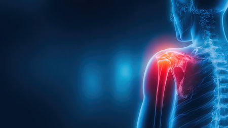 Close-up of a human shoulder joint highlighted in red to indicate pain and inflammation, set against a dark blue, abstract background.