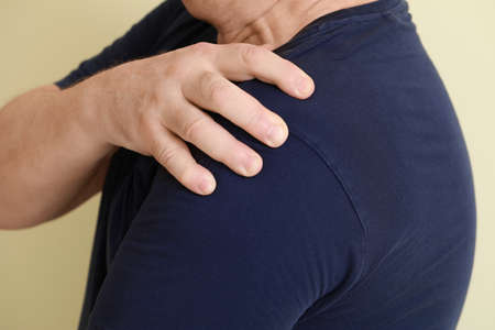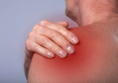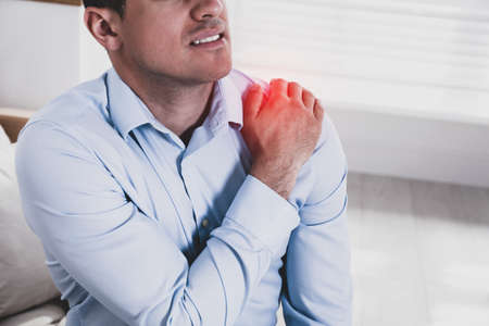 Shoulder joint pain, man with severe ache as symptom of osteoarthritis, close up with selective focus