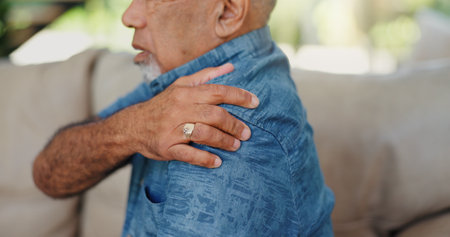 Senior, man and hands on shoulder pain on sofa with muscle tension, arthritis or osteoporosis. Elderly person, arm injury and joint ache in home with tendinitis, nerve damage and sprain in retirement