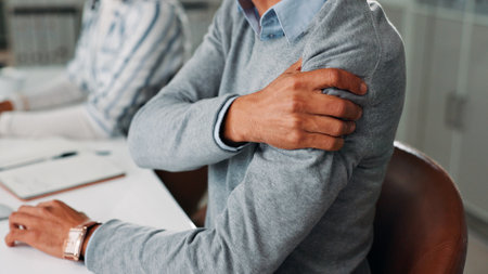 Business person, hands and shoulder pain in office with stress, burnout and overtime joint injury. Closeup, strain and employee with inflammation, massage and ache for osteoporosis or muscle tension