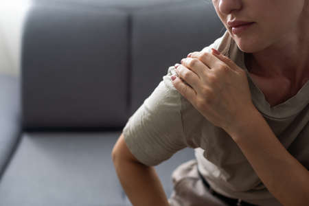 Woman with shoulder pain. Young woman with pain in shoulder. Suffering from pain in shoulder of woman.