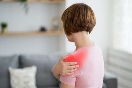 Woman suffering from shoulder pain. Trigger point. Hand holding shoulder with red point closeup. Health problems, medical aid and treatment concept. High quality photo