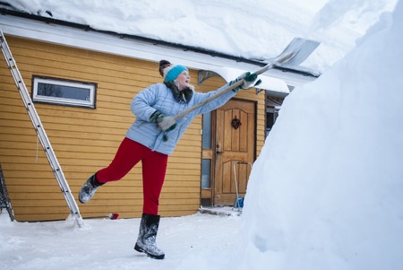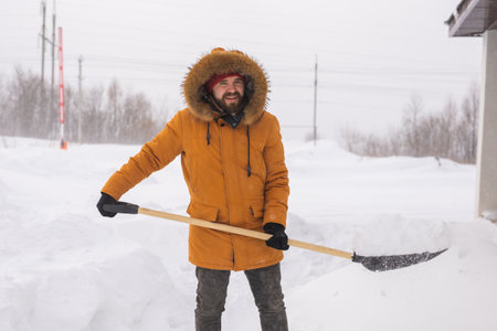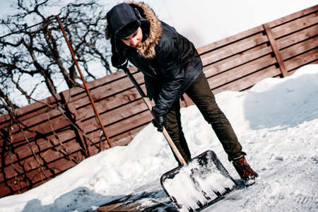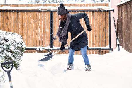 Portrait of young adult using snow shovel and cleaning snow in backyard or driveway